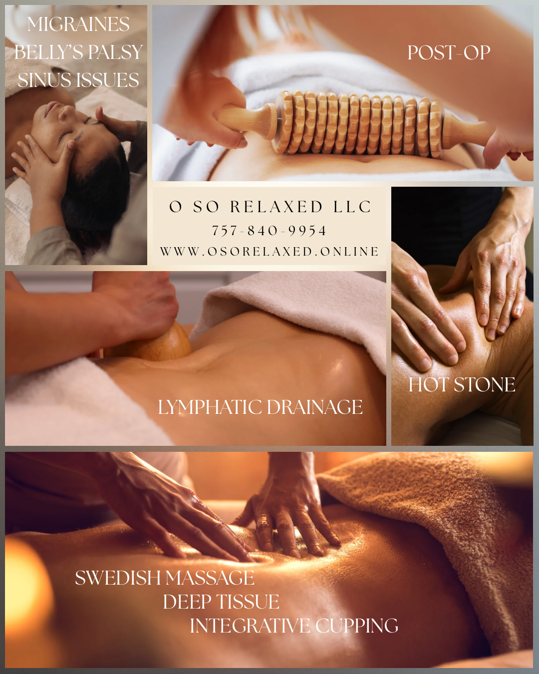 Options include: Swedish Massage, Deep Tissue, Lymphatic Drainage, Postnatal/Prenatal Massage, Migraine Therapy MassageTrigger Point Therapy, Hot Stone, Myofascial Release Massage, and Integrative Cupping Massage. Stretching may also be included, depending on the specific treatment needs.